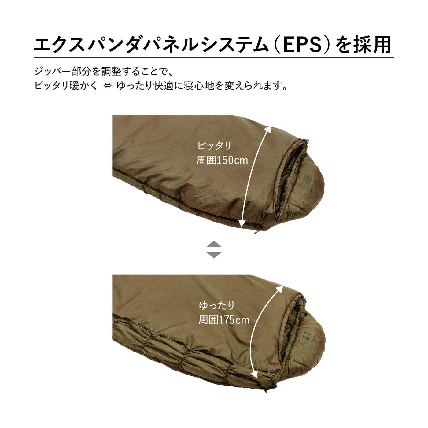 ●Snugpak EPS(エクスパンダ・パネルシステム)採用、横幅と長さを調整しフィット感による温度調整が可能。